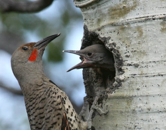 at the nesting snag. The robin sat on her nest while the bluebird pair appeared every ten minutes or so to deliver beaks full of insects to the cavity. While I photographed, Kelly painted aspen scenes. Every so often the flickers would zip past, carrying food to their squawking chicks some fifty yards behind us. A raven flew by carrying a youngster from a nest he had robbed. Western tanagers and fly catchers flitted around us. The male bluebird perched above me to preen.