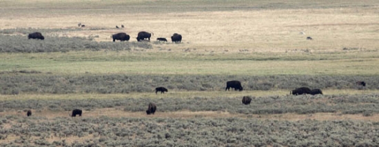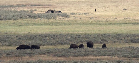 The attack, which began the night before, continued Sunday morning. When the bison got to its feet, the wolves appeared to try for the hamstrings. As the wolves ripped at the bison's flanks, a bull moved in and several wolves backed off. Even with the agitated bull present, some wolves continued to attack. A second bull arrived to help out. When four bison surrounded the downed cow, all but the alpha male backed off. The bulls checked out the now dead cow. The bulls moved on, and the wolves returned. The pack began feeding, knowing grizzlies would probably soon arrive.