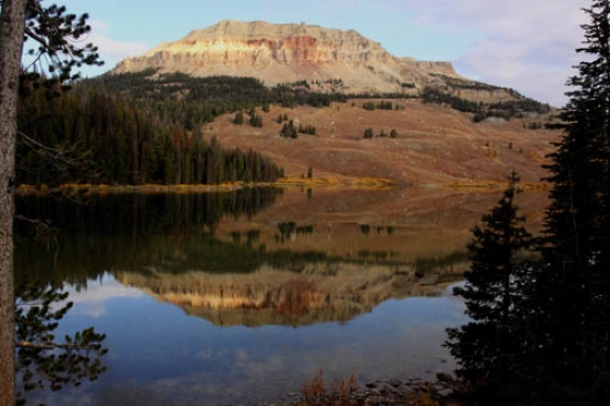 At Beartooth Falls a blue grouse sat under an aspen sapling. When I passed Beartooth Lake, I noticed Beartooth Butte cast a perfect reflection, so I stopped and snapped a few photos. A bald eagle has been perched above Little Bear Lake lately. This morning was no different. He left his perch to glide across the valley as I passed by.