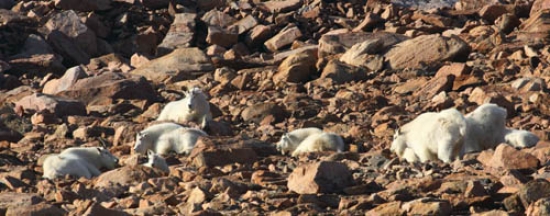 I crossed over West Summit and stopped to check the mineral lick. Sure enough eight mountain goats were hanging out. Some relaxing, others licking at the rocks.