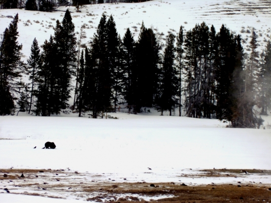 First grizzly sighting of the year! It was not a large bear, just rooting around in the thermal basins of Mary Bay. Its activity drew a crowd of ravens as if there was a carcass there. But there was not and soon he moved on. The bison nearby were not concerned in the least. They stood in the steam clouds with their lips to the ground grazing imperceptible vegetation.Soon we were on skis pulling our sleds heavily laden with food, fuel, and research supplies. I was accompanying a Utah State University research team whose efforts had in effect spanned 15 years of late winter monitoring in the Pelican Valley. The bison herd in the valley had dwindled through those years to what numbered less than 100. All of them were bulls, too. The cow and calf groups I used to see a decade ago, which alone were some 80 strong, were now gone. The reason? That was among the objectives of these investigations. Speculation ranged from improved access to habitat created by the network of groomed roads to a high density of predators like wolves and grizzlies.