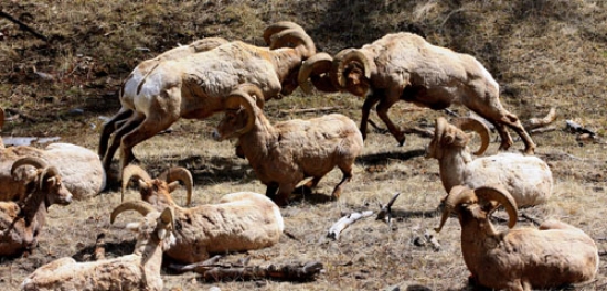 The two large rams continued their posturing and pushing around, then suddenly rose to their hind legs and slammed their horns making the little valley echo with a hollow crack! Instantly two younger rams followed suit, but their small horns gave off a higher clack.
