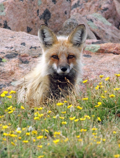 I arrived at West Summit just after dawn and who was there to great me. My mountain fox! The first time we've crossed paths since my camera fiasco. He just sat there in the flowers looking at me, before climbing up through the rocks to disappear.