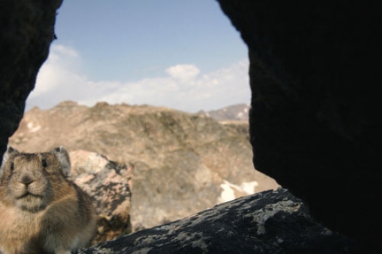 I was back at dawn, soon to be joined by George Clokey and twenty plus students from WhiteWater University, Wisconsin. I pointed out my camera trap to them and we sat quietly in the rocks to watch for pika. Sure enough, my little fella from the day before soon appeared above us. Causiously, he pikced his way through all the people to once again approach the camera trap. Even with two dozen kids watching, he just couldn't leave it alone!