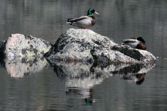 At the high ponds, a sand-hill crane strutted in a small meadow. Ducks and geese floated in the glassy waters. A young eagle sat nearby. A cow moose with yearling twins watched us from the trees. Farther along another moose, then a strange sight. A young moose with hair missing and a large white patch on its back. This could be one of the ghost moose we've heard about. Meaning a moose so covered with ticks, it's hair is turning white.