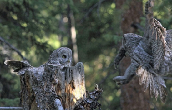 Late May of this year I finally got around to checking my Beartooth nests. I have a dozen nests the great grays have used over the last 25 years. Each year I try to make a point of checking each and every one of them. This year the Pebble Creek nest had already given me one nesting pair. Anyway, back to today. It was May 31st and I climbed the last steep hill that gave a vantage point of the old snag. I looked through the pine boughs. Nothing. I didn't really expect to find anything. But wait! Did I glimpse a bit of silver? I moved to a better spot. Sure enough. A face was looking back at me! How about that! After eight years!