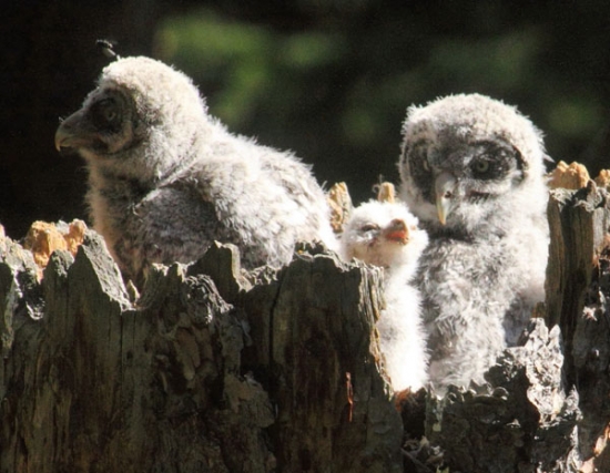 June 26th I alluded to how slim Pea Pickers chances of surviving in the first part of this story. Well, when I returned the next morning, I witnessed the female feeding the smallest chck to the other two.I was frustrated as I always am when a nest loses a chick. But, I know by past experiences just how the percentages where all against him. I've been involved with 25 great gray owl familys over the past 27 years. Of those, only three times did the third chick survive to fledging. That's only 12%!
