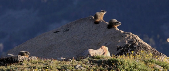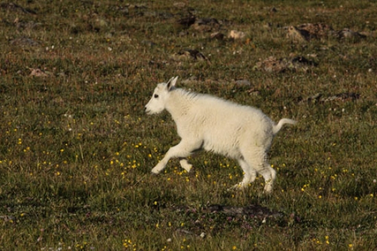 Marmonts climbed up the rocks to greet the morning sun. A golden mantled ground squirrel scurried across the highway. Over West Summit, then on to East Summit. Just below the ski lift, I spotted a mountain goat nanny with twins. A yearling grazed nearby.