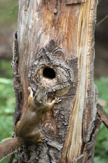 One morning, Cindy observed a squirrel running across our rail fence carrying a furry bundle in it's mouth. The squirrel then entered our yard and stuffed the bundle in an aspen cavity just a few feet from our window. It must have been the last of several trips because when she returned again it was to bring in bedding. We were pleased to have the family so near and looked forward to watching them grow, but luck would have it events soon changed everything.