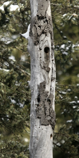 We dropped off the back side of the out-cropping to enter the level forest below. A check of a cavity high in a snag and we emerged from the timber to cross a wide meadow.