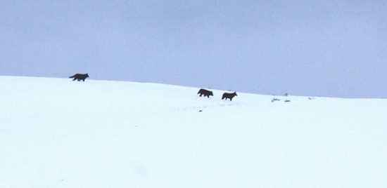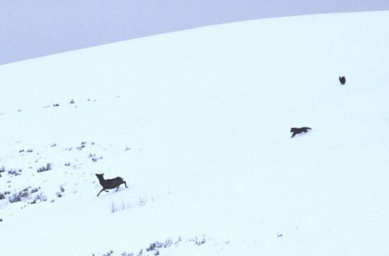 On Tuesday morning I arrived at the Buffalo Ranch just as the Lamar pups were approaching a small herd of elk. As I quickly got set up the chase began with the wolves soon singleing out a lone elk and chasing her downslope. Three blacks were involved with the gray watching from the ridge above. They really never got close and soon retreated to the top of the slope and out of sight.