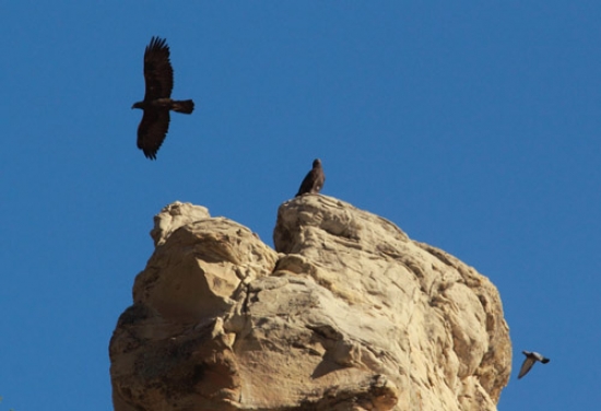 Now yesterday, I was back at the red cliffs over Dead Indian Pass. The eagles were not in sight. On towards Cody we spotted an eagle perched high on an out-cropping. As I was getting a few shots, a second eagle soared by, then circled to land just below the first golden. A few minutes later, the second eagle took off again, screaming it's piercing call. Another adult was perched a mile away.