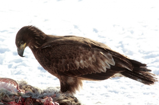 As usual I work on getting wolf photos the day after winter study ends. So on the 16th I was out at dawn. Coyotes seemed to be everywhere. Especially the little family in Round Prairie who I watched mouse for awhile. A bald eagle perched near Footbridge and a bull moose browsed at Elk Creek. Otherwise I saw only bison and elk.17th Today I combined looking for wolves with Christmas shopping in Bozeman. Cindy, Kelly and I left the cabin at dawn and passed through a very quiet Lamar Valley. In Lamar Canyon I spotted a tiny pygmy owl perched atop a snag. Near Floating Island, a northern shrike flew in to perch just beside the road. North of the park, eagles were everywhere.