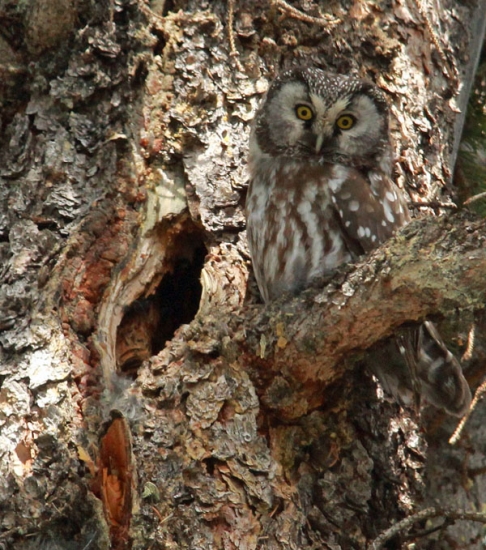 Late in the day as we returned to our cabin, we stopped to walk in and check our boreal owl nest. To our amazement, she was sitting outside beside the cavity! How about that! Then off in the forest a couple hundred yards distant, two pygmy owls began to call.