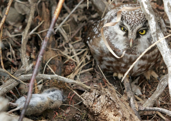 All spring I've been trying to get a glimpse of a boreal owl. And I have now and then. But on Wednesday I got a good long look and it broke my heart.About 10 in the morning I got a call from Tom at the Cooke City Post Office. It seems an owl with a vole was lying just a short distance from the post office door. I hurried to town and didn't like what I saw. A male boreal owl was lying upside down on the concrete. At first sight he looked to be dead, but as I knelt down he opened his big yellow eyes.