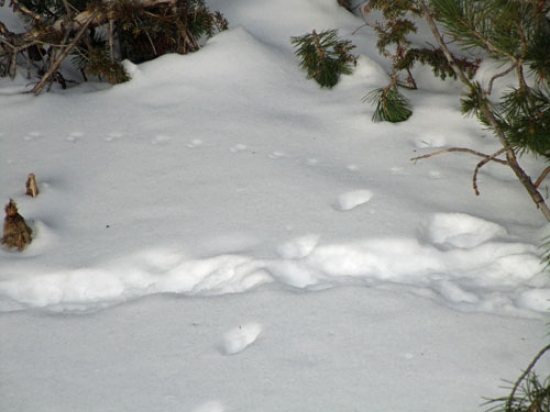 Early on we came upon lots of animal tracks. In fact, the mountain slope and forest edges seemed alive with wildlife. Marten, ermine, squirrel, mice and grouse tracks criss-crossed the powdery snow. At the base of a long slope that led up to a series of ledges, we came upon mountain lion tracks. There appeared to be two individuals. Sometimes they were traveling other times playing.