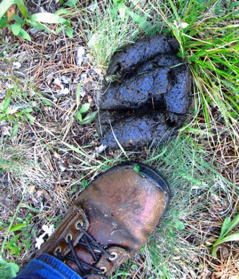 We were about a half mile from our car when the strong smell of bear drifted from the forest. Soon after we found tracks in the mud. Also a fresh scat that was still somewhat green. While the previous dozen or so scats we had seen were probably from a black bear, these droppings were easily more than twice their size.