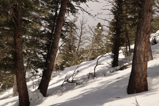 Today I snowshoed in to where we heard the boreal last night. The snowshoeing was not good at times. The snow was 40 inches deep and I was attempting to zig zag up a steep incline. I didn't make it as high as I would have liked, but I still made it far enough to locate two cavities the owl is probably considering for nesting sites.