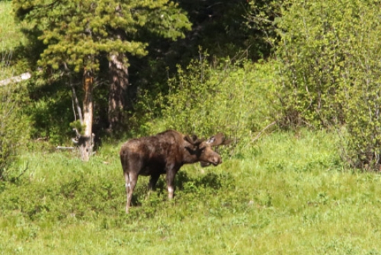 Eventually, I emerged back in the big meadow. I expected to see the elk cow again, but instead found two bull moose feeding 75 yards away.