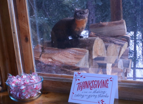 We've had three martens off and on this winter so far. Our big male from last year was no surprise, but a yearling that seems to have moved in has been.Thanksgiving Eve, the little fella spent the whole day perched on wood stacked on our kitchen porch watching Cindy bake pies.