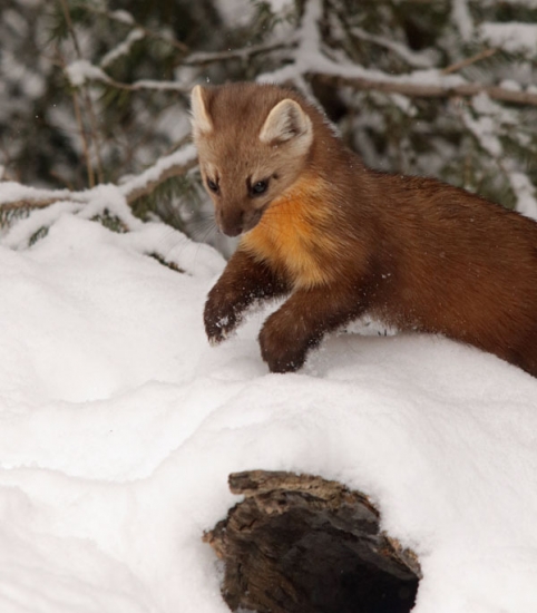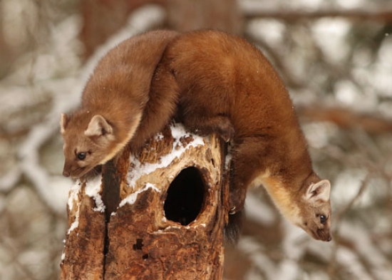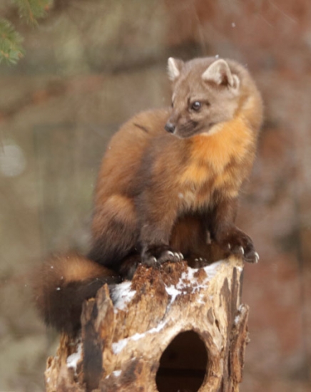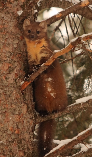 As I am writing this story, we are in the middle of a five day snowstorm. I've already blown out our driveway entrance which maybe I really should not bother as we've been officially closed since last March. Of course we want UPS and Fed-Ex to be able to come to the cabin and we do welcome scheduled groups who follow our covid protocol at our gallery. Outside my window braving the dumping snow, I can count four martens. This sounds amazing, but actually earlier I saw six. Heck one morning there were seven. We feel we've had at least nine different individuals visit one time or another this winter. In the winter of 92/93 we had eight martens and in the tough 2010/2011 winter we also had nine. So as you can see this richness of martens does not happen often. Since this has not been a rough winter, I can think of two reasons for our high numbers. Probably the number one reason is Covid. While we would normally have one or two groups visiting every day, we now have maybe one or two per week. So obviously the cabin has been quiet. Also we've noticed most of the martens are youngsters. One to two years old. This means they tolerate each other. Now when I say we have only a couple groups per week, we've had our share of photographers lined up on the highway pointing cameras at our cabin. Most stay in their cars and stay a few minutes, moving on when another car or truck approaches. However, some stay for hours, parking their car against traffic and walking up and down the road. This is extremely dangerous. Some even walk up into the yard. Now, for the reason for this article. I'd like to introduce you to this years marten crop. Early winter, our resident male of the last four winters was our only marten. We call him "White Chin" for identification. Then a second large male appeared. He was also familiar to us as he visited about once a week all last winter. We call this one "Intruder" as he always comes from across the road. He's now easily as big as White Chin. Both of these martens are dark in color with brilliant orange throats. Soon a pair of younger paler colored martens appeared, I believe both to be females. They often come in together and will even groom each other. We call the larger of the two "Dot-Dash" because of the markings on its throat and the other one, "Pale Face". Then another female appeared. This one is tiny with dark markings that mirror the large males. She would be only nine months old. A couple of weeks ago, two more martens joined the pack. One is of the pale variety with gray ears and wild eyes. The other is our prettiest marten yet. A dark chocolate coat witth a brilliant dark orange throat littered with dark spots. We believe this to be a young male and call it "Two Dot" Over the last month, White Chin had disappeared. We wonder if Intruder has displaced him like White Chin did to another resident male years ago. Some of you will remember "Snaggletooth". On any given day we will see Pale Face, Dot-Dash, Tiny, Wild Eyes and Two Dot. Usually all at once. Then Intruder will make an appearance every couple days. And I know we've got one or two more we haven't identified. The martens have kept us entertained over the winter, and we'll continue to keep it quiet around the cabin. Note: Marten sightings are up in the Park also. I had one cross the road by the state line. We spotted a pygmy owl east of Floating Island.