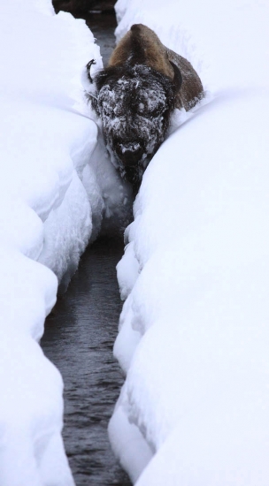 Back in January, a bison that resided all winter in the willows just outside Silver Gate, decided to come calling. Fro some reason he waded through deep snow to get to our back deck, then climbed over a 10 foot drift of snow to stand on our front porch. That’s when I heard the hollow sound of his hooves on concrete and looked out to see his huge back blocking the window. He then followed our shoveled path to the back of our cabin then took my snowshoe trail up into the woods.