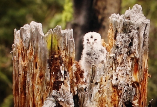 June 21st Arrived at 7:45 am. Watched male hunting in the aspen behind my hide. Everything was soaked as it had rained all night.At 10:15 the female suddenly became excited and started hooting. A few seconds and she darted off the nest from a seated position. I've never seen her so excited.