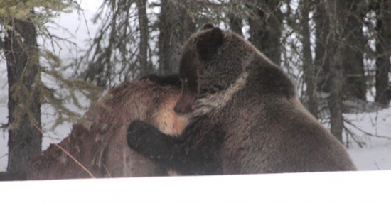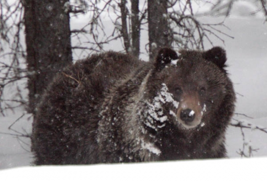 The grizz fed for a short time, then slowly moved down to the creek to drink before bedding under an over hanging tree. At that time the snow came down so heavy the scene was lost to us. A half hour later the snow lessened and the bear returned to feed.