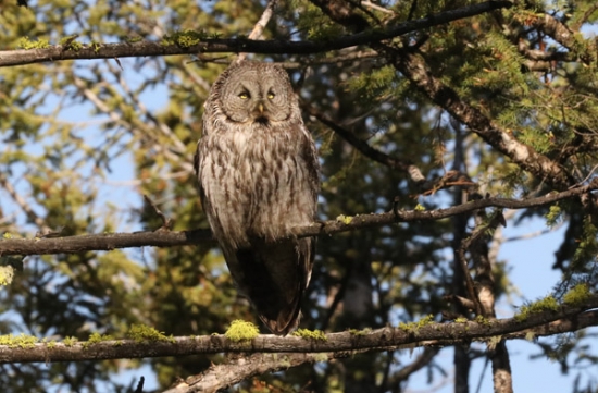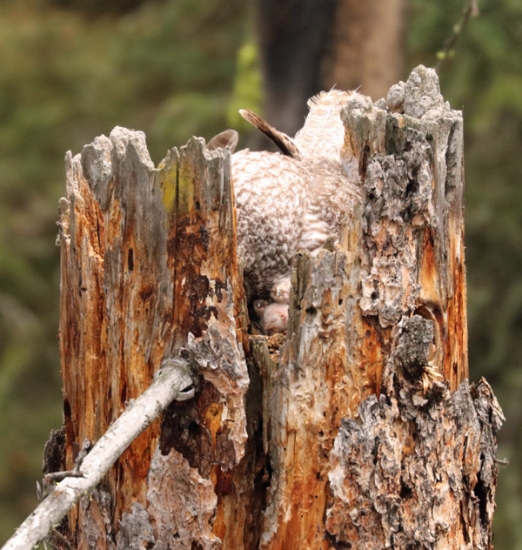 Arrived at the nest at 6:50am. Female feeding unseen chicks. At 7:00am we hear a crack to our left. At 7:10am Cindy spots a cinnamon black bear coming our way. Female stopped feeding and stared at the bear. Bear came within 30 feet of us before he noticed. He then stared at us bit then raced off. Crashing through the woods. Male flew in and perched behind the nest. After a bit he flew off and the female continued feeding. Five minutes later, the male flew in with a pocket gopher. He sat above the female, but she wouldn't acknowledge him. He even taped her on the shoulder twice. Finally he flew off to perch behind the nest. Presently he ate the meal himself. Now the female began begging for food. Awkward! Finally the male flew off to the south and perched. There he preened while the female continued to beg. Silence for one hour. At 8:30am she began begging. Male responded with long series of hoots. 8:55am male hooted and flew off to perch to the north. He then hooted several times. Female begged. Left at 9:30am