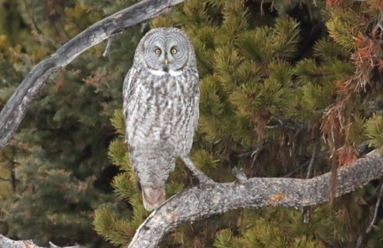 On our way back to the cabin, just before dark, Cindy spotted a great gray owl, near Cooke Pass. We filmed it for a few minutes before it dove into the snow for a rodent, then flew back into the timber.